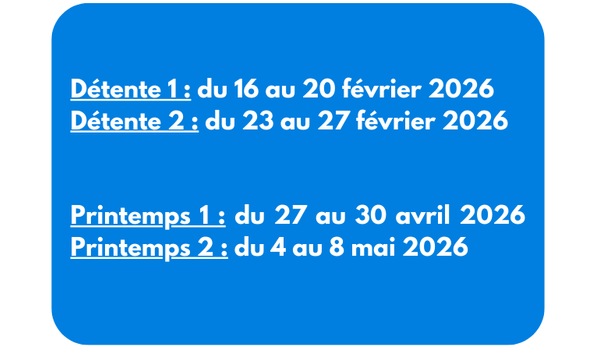 Ci-dessous, retrouvez notre offre de stages. Sur le bouton “Inscriptions”, vous pouvez vérifier les disponibilités, en fonction des périodes de congés.